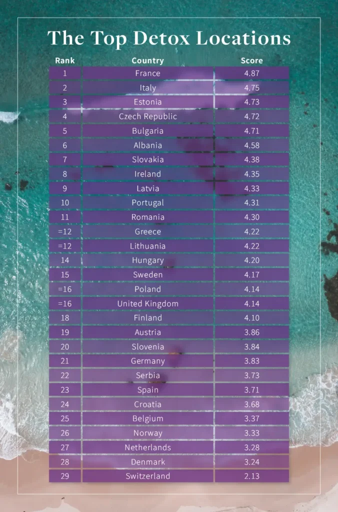 This table ranks European countries based on the best place for a digital detox. To provide this ranking, 7 different factors were used. Once the data was collected, the factors were then indexed, to give them a value between 0 and 1. These values were then summed, to provide a total score for each country, out of a maximum of 7. This score was then used to rank the countries, with a higher value providing a better ranking.