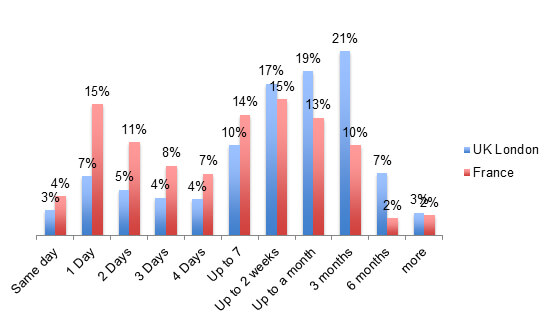 The table demonstrated that almost 60% of French bookings occur within 7 days before travel compared to 33% in UK (London airports), the UK customers are booking much further in advance, with 66% of the bookings occurring more than 7 days out and 21% up to 3 months out (compared to 10% for France)
